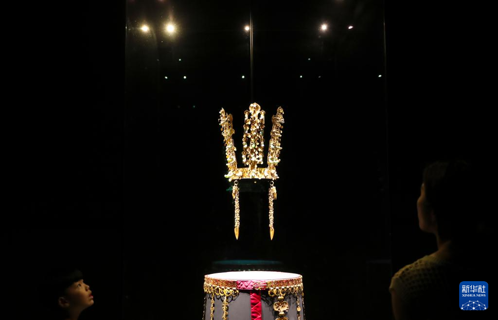 8月1日,游客在韓國慶州博物館參觀新羅時(shí)代的文物金冠。