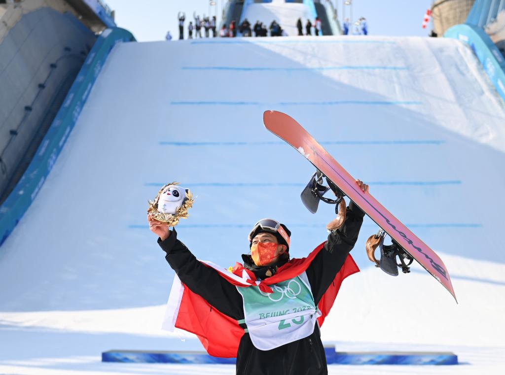 2022年2月15日,北京2022年冬奧會(huì)單板滑雪男子大跳臺(tái)決賽在北京首鋼滑雪大跳臺(tái)舉行。圖為蘇翊鳴在奪冠后慶祝。新華社記者 黃宗治 攝