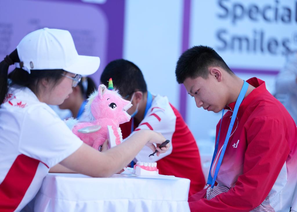 12月8日,在廣東省中山市體育館副館,工作人員為特奧運(yùn)動(dòng)員普及護(hù)齒知識(shí)。新華社記者 楊晨光 攝